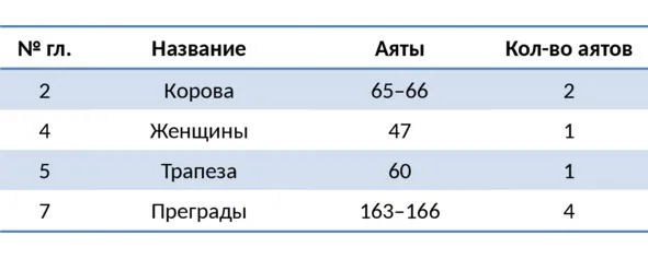 В главах Корана «Корова», «Женщины», «Трапеза» и «Преграды» Бог упоминает нарушителей субботы. Им посвящено восемь аятов:
