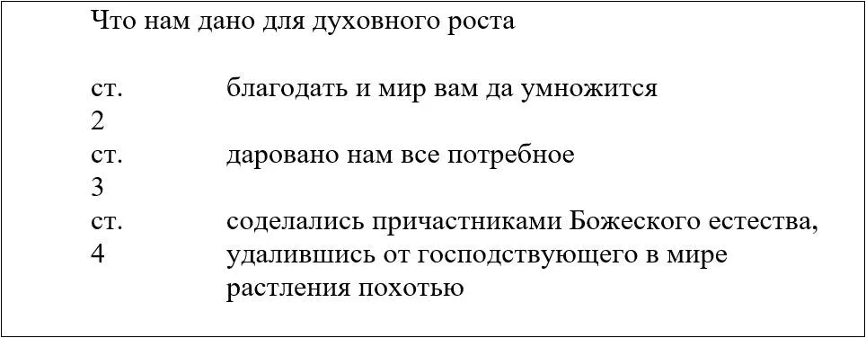 Как мы уже разбирали в предыдущей главе, для духовного роста нам даны благодать и мир. Эти ресурсы у нас уже есть и продолжают умножаться (ст. 2). Без них духовный рост был бы невозможен. Вдобавок к этому, Бог сделал нас причастниками Божеского естества (ст. 4а) через пребывание в нас Святого Духа. То есть можно сказать, что для духовного роста нам дан дар Духа Святого. Но и это еще не все. Господь сделал так, что мы удалились от растления похотью, которое господствует в мире (ст. 4б), то есть нам дана новая природа через дар рождения свыше. Подробнее об этом мы будем говорить в последующих главах. А пока я предлагаю обратить внимание на главную мысль всего отрывка, которая помещена в середине 3-го стиха: даровано нам все потребное для жизни и благочестия. Центральная мысль всего параграфа заключается в том, что нам уже дано все, что нужно. От нас ничего не удержано. Ничто не забыто. Ничто не пропущено. Нам дана вся полнота.
