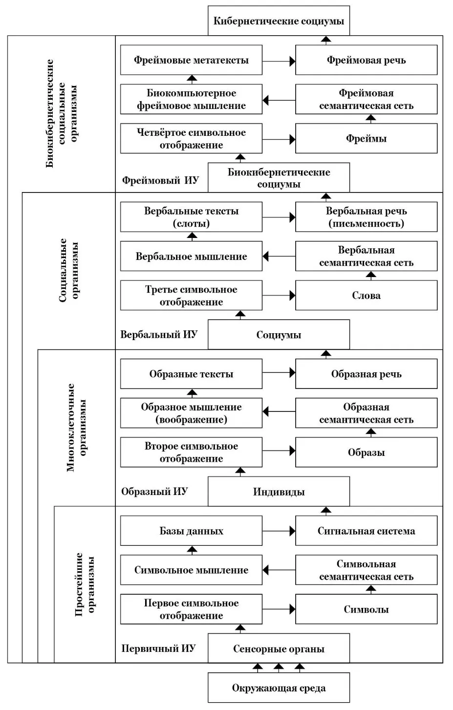 Итак, мы рассмотрели движение и функционирование информации от первичных баз данных, отображающих конкретные события окружающей реальности, к вербальным текстам и базам знаний, аккумулирующим наиболее общие законы и принципы существования действительности. При этом важно, что на всех наблюдаемых иерархических уровнях семантика информации поддерживалась тезаурусом ИС, базовая часть которого является врождённой, то есть закладывается в систему материнским организмом. В случае искусственных ИС таким материнским организмом является человеческий социум.