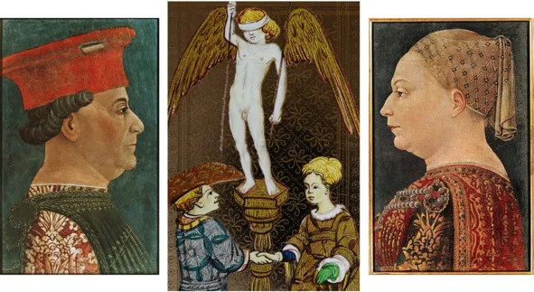 Рис. 42. В центре – Влюбленные из колоды «Cary-Yale Visconti-Sforza», слева – портрет Филиппо Висконти, справа – Марии Савойской