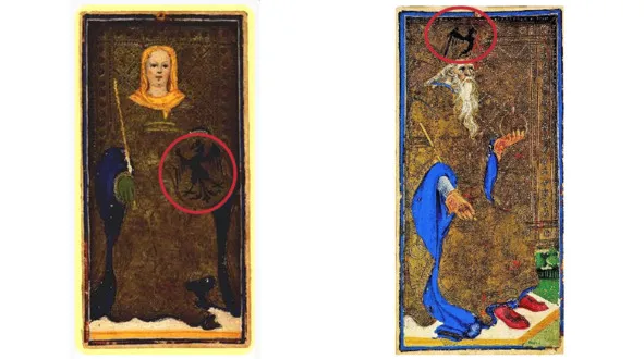 Правда, в Марсельском Таро орлы золотые, зато именно черные птицы есть на картах Таро Colleoni-Baglioni (Таро Висконти-Сфорца). Мы видим этот геральдический символ на щите у Императрицы и на шапке у Императора (Рис.47)