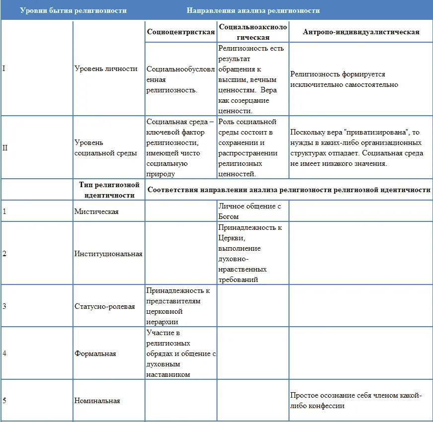 2. Ценностнообусловленная религиозность – социальноаксиологическое направление. Ценностнообусловленной религиозности в целом сооответствует мистическая и институциональная религиозные идентичности.