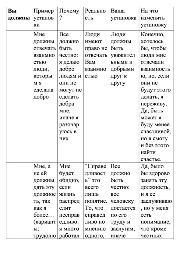 Вы крутитесь на 2 работах, при этом отводите ребенка в садик и еще вечером, забрав его, готовите ужин. Муж только работает и не так, чтобы хорошо, а средне. Вам обидно: «Как же это так, почему я надрываюсь, а он только работает и ни в чем мне не помогает. Это не честно!!!» Обида разрывает Вас. Вы думаете, что он должен понимать несправедливость распределения обязанностей. Реальность: муж хорошо устроился: немного поработал, вечером телевизор, ну и понятно, что это не он будет готовить – это дело жены. Повышение? Ну пока не получается, посмотрим, может в будущем. Он не обязан ни отвечать взаимностью, ни разделать Вашего мнения и, если Вы с ним, значит Вас это устраивает, потому что Вы думаете, что лучшего – то Вы недостойны или что все лучшее уже разобрано.