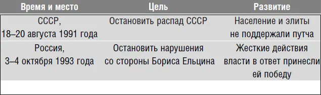 Одновременно перед нами проходят процессы неудачных революционных изменений, когда планируемые результаты не достигаются. В этом случае вводимая нестабильность (асинхронизация государства и общества) либо подавляется со стороны власти, либо активно не поддерживается населением, что приводит к самозатуханию революционной ситуации. Такими примерами могут служить августовский путч 1991 года в Москве и расстрел парламента России в октябре 1993-го. И в том и другом случае одним из основных игроков был Борис Ельцин, в первом случае он получал власть, во втором – защищал (см. табл. 7).
