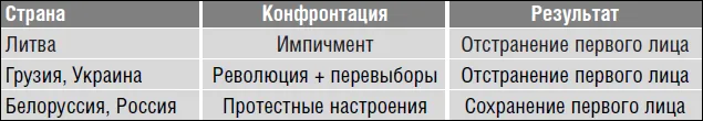 Тут следует вспомнить и ситуацию в Литве, когда элита «вытолкнула» Роландаса Паксаса с поста президента путем импичмента, но сделала это все же легальным способом. Первое лицо и элита также попали в конфронтационный цикл, завершившийся отстранением. Перед нами возникает несколько вариантов разрешения межэлитного конфликта, кроме более простого варианта смены в результате выборов (см. табл. 2).