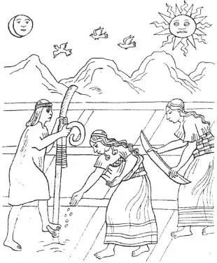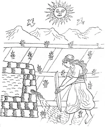 У индейцев не было плуга и никаких тягловых животных, мужчины пользовались ножным плугом (как они делают до сих пор), и простые крестьяне и крестьянки проводят всю работу денно и нощно (рис. 9а).
