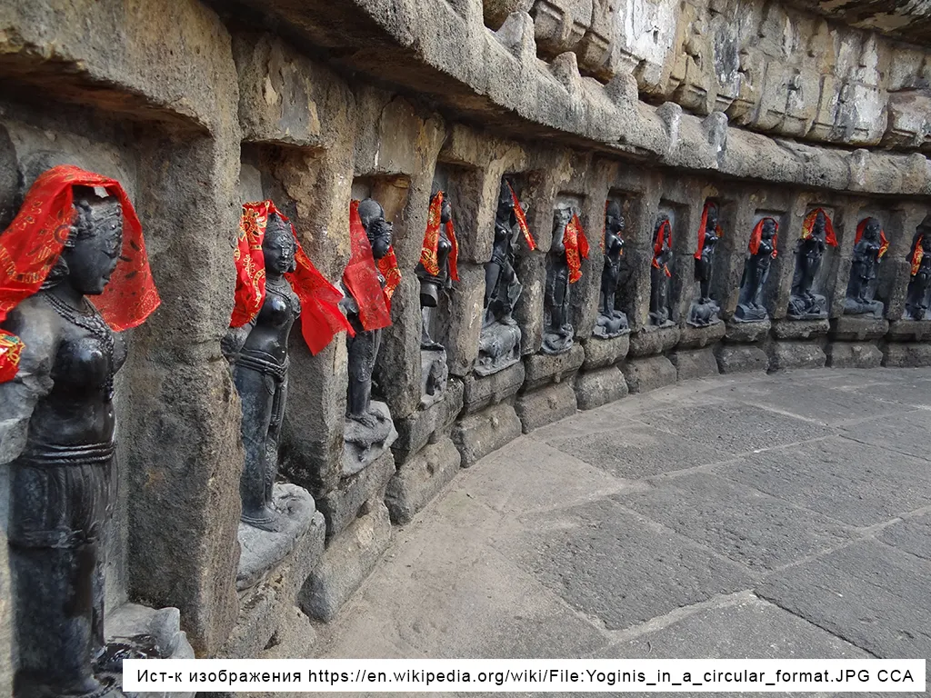 Существуют храмы 64 йогинь, сильно отличающиеся от традиционной храмовой архитектуры. Храмы 64 йогинь представляют собой круглое каменное строение без крыши, вдоль стен которого располагаются статуи или изображения 64 йогинь. Большинство из них изображают женщин с пышными формами в соответствии со средневековыми индийскими канонами красоты. Они полуобнажены и украшены большим количеством браслетов, ожерельями, диадемами и поясами. Но среди них есть и фигуры с искаженными, страшными лицами или с головами животных, например, лошади, слона, леопарда. Йогини как бы движутся по кругу, возможно, обозначая колесо времени – Кала-чакру, янтру или мандалу. Исследователи предполагают, что крыши в этих храмах отсутствуют потому, что йогини слетались в них с небес, и эти строения выполняли функцию некоего аэродрома.