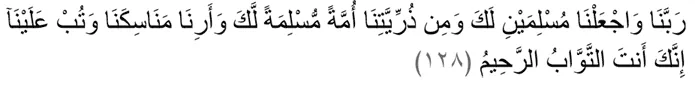 «Раббана ва джаальна муслимайни лякя ва мин зуриййатина умматан муслиматан ва арина манасикяна ва атуб алейна, иннакя анта таввабу рахим».