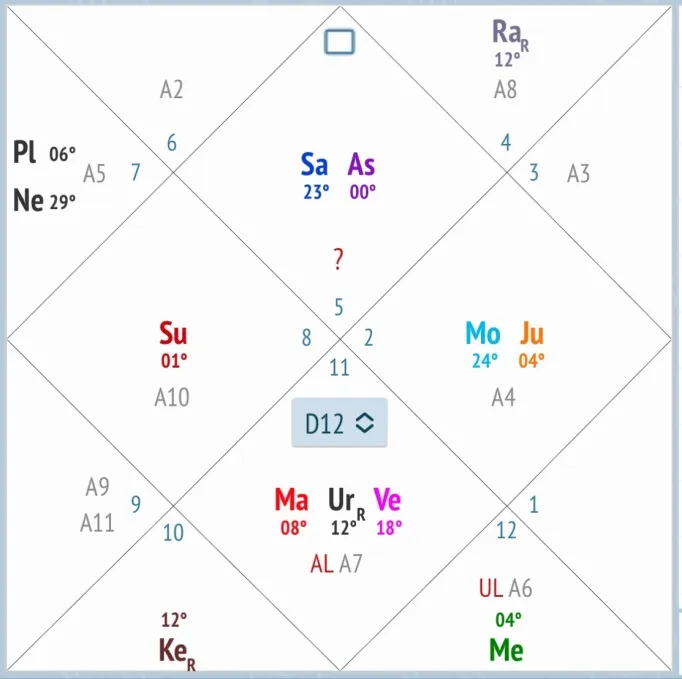 В гороскопе Д-9, дополняющий основной Д-1, Сатурн находится в 12-ом доме потерь и смерти, и является хозяином 6-го дома несчастных случаев и болезней.