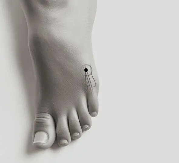 Расположение точки: Точка GB43 находится на тыльной стороне стопы, в конце межпальцевой складки между IV и V пальцами стопы.