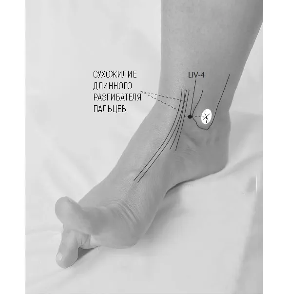– Найдите точку Liv 4 на ноге (на 1 большой палец впереди от медиальной лодыжки).