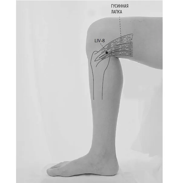 – Найдите точку Liv8 в области медиального конца подколенной складки.