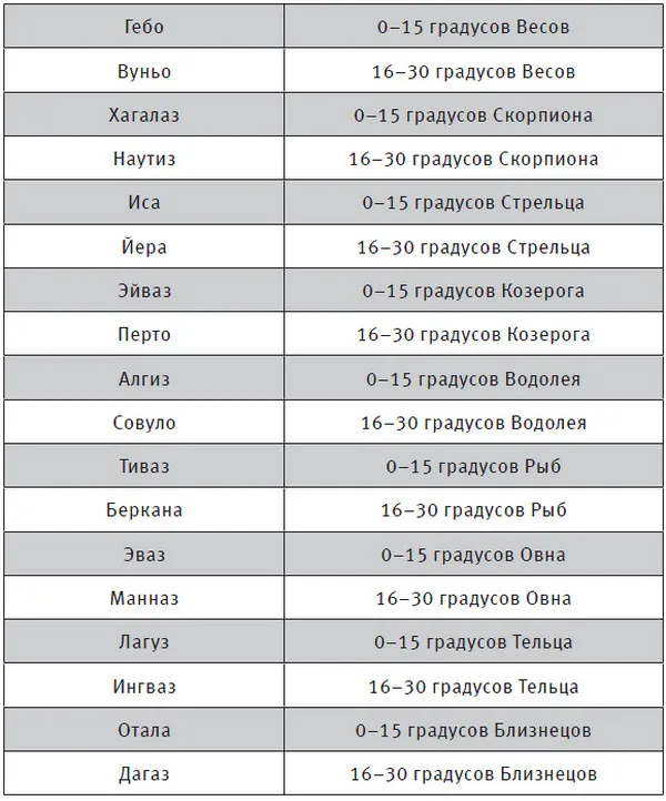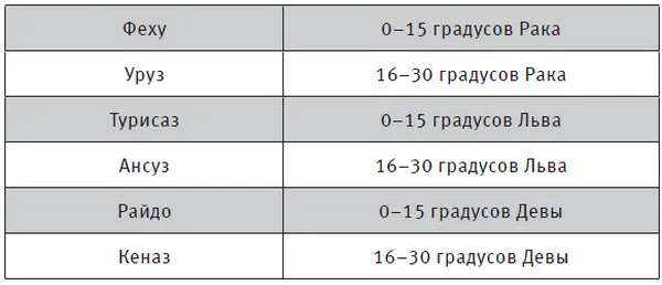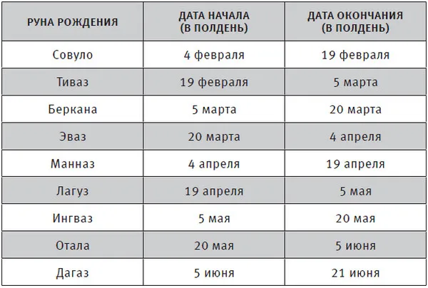 Самый простой способ найти свою руну Сунны – посмотреть в приведенной ниже таблице. Вы увидите, что каждому знаку Зодиака соответствуют примерно 30 дней, а каждому сигилу – примерно 15. Поэтому энергетические ассоциации в рунической астрологии точнее, чем в классической.