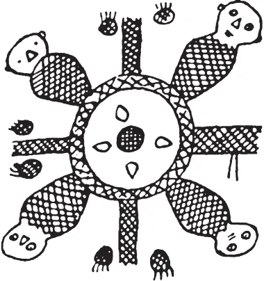 Каждая отдельная окружность символизировала солнце, каждая обозначала бога. Четыре точки, расположенные на вершинах квадрата, являлись не чем иным, как частями центральной, частями главного божества. Четыре бога по углам мира объединяются в едином божестве – Тсакол, Битол, Алом и Каналом.