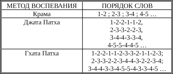 В «Крама Патхе» первое слово мантры добавляется ко второму, второе – к третьему, третье – к четвертому, и так далее – до тех пор, пока не будет произнесено все мантрическое предложение. Такая патха (метод воспевания) дает адепту возможность знание не только отдельных слов, но небольших цепочек слов, а также какие изменения происходят при этом в сварах.