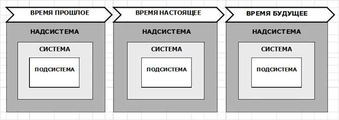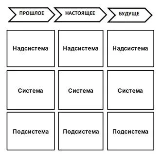 Или, по диагонали слева направо и вверх. Изменение в подсистеме в прошлом, не произвело заметных изменений в системе и надсистеме в прошлом, но привело к значительным изменениям в системе и надсистеме в настоящем времени. Также, возможен вариант изменений слева направо вниз.