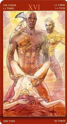 Этот Аркан в колоде удивляет тем, что неминуемый крах ждёт каждого героя сцены. Томящаяся от нежности девушка сейчас испытает внезапный шок, её жизни тоже угрожает серьёзная опасность. Любовник не подозревает о разъярённом мужчине с топором за его спиной. Да и сам мститель, ринувшийся вершить самосуд, сейчас загубит свою жизнь и навсегда получит клеймо убийцы.