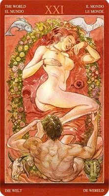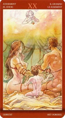 После разных эмоций и жизненных ситуаций мужчина и женщина наконец-то вместе. Они связаны узами брака и отношения их настолько серьёзны, что даже ангелы благословили этот союз. Ребёнок же – это плод любви, который был рождён в законном браке. На этой карте все обнажены, это как знак полной открытости, доверия друг к другу.