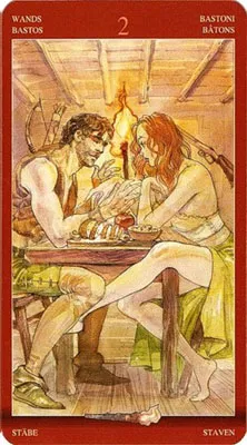 Акцент на руки двоих. Он кладёт ладонь ей на живот, она обвивает кистью его плечо. Чем дольше мы смотрим на карту, тем больше женщина выглядит беременной. Округлые пышноватые бедра, гармония в выражении лица, очень удобная поза. Другой рукой мужчина прикасается к её волосам, всматриваясь в лицо. Возможно, интересуется самочувствием и настроением возлюбленной. От карты веет теплом и уютом, в камине горит огонь, а в нём две фигуры, мужская и женская. Как и любой туз Таро, это начало, зарождение и источник. Карта очень позитивна и созидательна, одно из классических толкований – дом, семья, рождение.