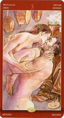 Главное толкование карты – тепло. Во всей колоде трудно найти более нежную сцену любви. Сильный мужчина обнял девушку полностью. Она хрупкая и маленькая, прижалась коленями к его груди. Ласковые объятия и поцелуй полностью обнажённой пары и в этой картине нет такой эротики, в которой не присутствовала бы любовь. Это крепкий тандем, построенный на взаимопонимании и доверии. Девушка в данных отношениях может быть ребёнком и не бояться, что его обидят (у девушки согнутые колени – поза зародыша). Вещи в комнате разбросаны, видно, что секс спонтанный. На карте преобладает коричневый цвет – олицетворяет преданность, надёжность, стабильность, здравый смысл.