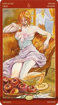 Посмотрим на карту и с другой стороны. Романтический ореол бесподобен, но оба партнёра полностью одеты, и в эротическом Таро это имеет особый смысл. Нежелание открыться, раскрыться и обнажить душу при внешней страстности и даже растворении друг в друге. За такой символикой может скрываться показная идиллия при полном незнании друг друга как личности. Скрипка, розы, он – до мозга костей романтик, а она – писанная красотка. Чем не идеальный роман? Вместе мы смотримся безупречно, но открыть душу не хотим.