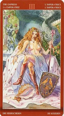 На руке браслет из монет как у Жрицы на ноге, что означает обеспеченность и поэтому знает, что любое желание будет исполнено. Ей присущ некий цинизм и за невыполнение её желаний приказаний человек может быть наказан. Она не развратна, но знает силу своей сексуальности, чем и пользуется. Она сильна духовно и физически. Так же карта может означать вероятность зачатия.