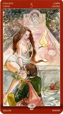 Женщина сидит на краю большого каменного бассейна с мутноватой розовой водой. Стихия Воды, как область чувств прошлого, находится за её спиной, но она ещё частично повёрнута к своему былому счастью. Концы её волос плывут по воде, и это говорит, что мысли вертятся в переживаниях, которые трудно отпустить. Фантом лица леди виден в воде и соединён с кончиками волос, словно сама её душа осталась в глубине внутренних метаний и даже не принадлежит ей.