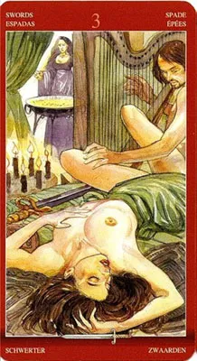 Всё неопределённо и непонятно, двойка Мечей указывает на нежелание конкретики одним из партнёров, ну или проще говоря человек не определился и водит за нос другого. Чаще всего это относится к женщине, она ещё не выбрала, хочется, но колется и сама не знает, что делать, хотя пришла «в гости» и пьёт шампанское с мужчиной в его квартире. Аркан олицетворяет собой тот случай, когда ни одно из решений не выглядит правильным и есть острое желание уклониться от его принятия хотя бы до следующего раза. Иногда карта указывает на то, что поступившее предложение (или приглашение) выглядит весьма заманчиво, но вот возможные последствия или вытекающие обязательства портят всю картину и отбивают желание.