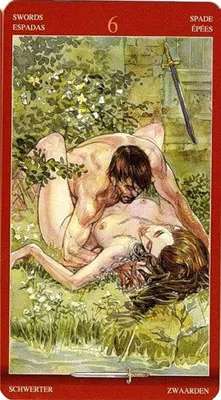 Энергия этой карты может «ударить в голову», как крепкий алкоголь, игнорируя все правила и демонстрируя лёгкость и свободу во всём. Утрата равновесия в этом случае может исказить реальность восприятия, но при этом как ветром унесёт былые страхи, боль утрат и разочарований. Платье на Пятёрке Мечей сбрасывается без сожаления, как досадная помеха, а тот, кто помогает это сделать, является партнёром на один раз. Привычное будничное течение времени нарушается экспромтом с внезапно возникшей свободой, взлётом эротического вдохновения и спонтанностью происходящего. Аркан символизирует иррациональность всего происходящего, поиском приключений и желанием рискнуть в этот раз.