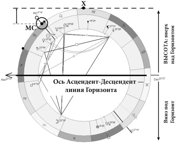 Астрономически, МС – это точка пересечения эклиптики и меридиана. Меридиан – это линия, на которой происходят верхние кульминации звёзд и планет. В Карте на рис. 3b Солнце как раз кульминирует: оно достигло своей максимальной высоты над горизонтом, в этот день, 4 февраля 2017 года! И дальше будет уже опускаться к горизонту. А в этот момент оно достигло своей максимальной, как говорят астрономы, полуденной, высоты над Москвой, в 18°08» – и всё: это его пик, его предел! Да, находясь строго на МС, Солнце находится на пике своей высоты! А Венера? Венера располагается левее, восточнее Солнца. Она имеет свою высоту, уже в 27°, но ещё продолжит подниматься над горизонтом. И она будет подниматься до тех пор, пока МС не окажется в 0°40» Овна. И только в этот момент Венера достигнет своей максимальной высоты над горизонтом. И это будет высота 36°36».