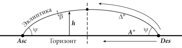 Рис. 4. Плоскости Горизонта и эклиптики в проекции Меркатора. Горизонт представлен, как прямая линия (осевой срез проекции), а Эклиптика – соответственно дугой. На чертеже введены следующие обозначения: h – высота над горизонтом; A – угол, отсчитываемый в плоскости горизонта, от Десцендента, влево (на восток, по ходу зодиака);∆ – будет углом, в плоскости Эклиптики, отсчитываемым от ДЕСЦЕНДЕНТА по ходу зодиака; β – эклиптическая широта данной точки (выше/ниже от Эклиптики).