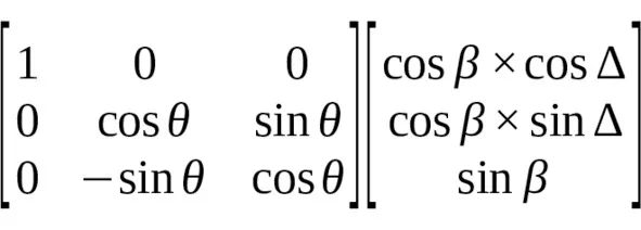 А это сделать элементарно. Есть две плоскости: они пересекаются вдоль некоторой оси под определённым углом. Разумеется, угол наклона эклиптики к горизонту непрерывно меняется. Но пусть в некий, выбранный нами момент времени t0 он будет равен некоторому значению θ. Две данные плоскости тогда можно математически связать, через сферическую систему координат единичного радиуса, следующим образом: