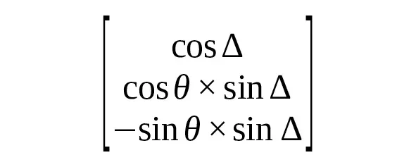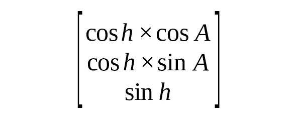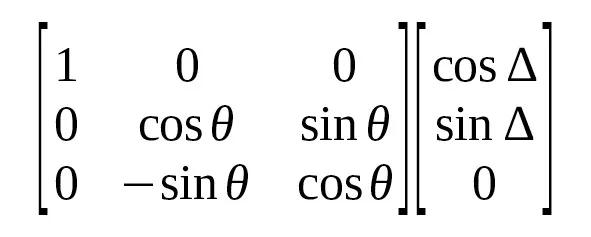 В левой части уравнения, до знака равенства, описано положение любой точки небесной сферы относительно плоскости горизонта. А что в правой части, после знака равенства? Вторая матрица, самая правая, очень схожа с первой. Это верно, поскольку они имеют похожий смысл. Это положение всё той же точки, но уже относительно плоскости эклиптики.