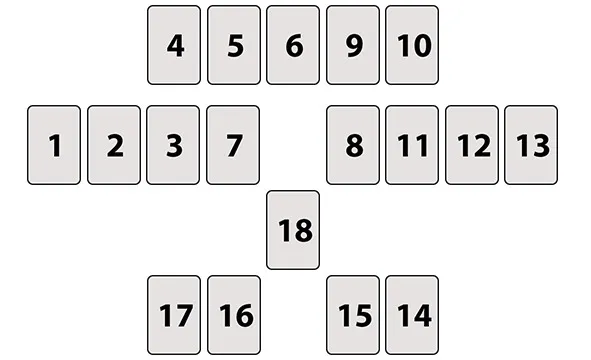 Этот расклад выполняется с помощью карт Младших Арканов и дает общую оценку ситуации. Но это не мешает Вопрошающему получить большой объем информации. Из колоды, предварительно перетасованной, достаются семнадцать карт, к ним добавляется Сигнификатор, выбранный наугад, и все это выкладывается по схеме. Расположение Сигнификатора здесь не определенно, поэтому он может выпасть в любом месте расклада, привлекая, таким образом, внимание Вопрошающего к той или иной области его жизни. Например, Сигнификатор вышел под номером восемнадцать. Смотрим по схеме: 18 – это исход гадания.