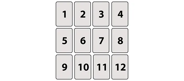 Допустим, в раскладе выпали такие карты: 1,2,3,4 – Семерка Кубков, Колесница, Шестерка Монет, Правосудие. 5,6,7,8 – Паж Посохов, Двойка Мечей, Туз Посохов, Семерка Монет. 9,10,11,12 – Девятка Посохов, Девятка Кубков, Двойка Монет, Четверка Мечей.