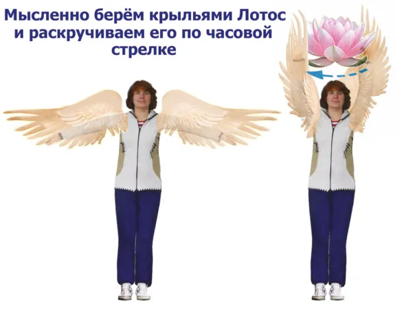 – Переориентируем плоскости ладоней в обратную сторону и этими же руками-крыльями, произнеся в пространство слово «очищаю», из того же положения, в котором они оказались после раскручивания, начинаем плавное движение ваших крыльев в обратную сторону против направления движения чакры, мысленно собирая в крылья в объёме цветка ту энергетическую грязь, которую вам разрешают собрать на данный момент Высшие Силы. Это похоже на то, как упавшее в реку дерево начинает собирать с поверхности воды протекающий мусор и пену, оставляя за собой чистую воду. Разница лишь в том, что таким образом очищается не только поверхность лотоса, но и весь его объем. Понимая, что из ладоней истекает мощный Свет, с его помощью мы осветляем ту грязь, которую собрали крылья. Это осветление мысленное и оно должно сопровождать весь ход рук справа налево. Если люди чувствуют в некоторых местах положения рук усиление сопротивления движению, это значит, что вы попали на сгусток тяжёлых энергий. Поэтому приостановите движение и дождитесь, пока естественным образом это уплотнение не растает, соприкасаясь с излучаемой энергией ладоней. Далее продолжите движение рук до предельной точки, уместной для вашего тела. Надо помнить, что чакра крутится, и вы чистите не только её половину, но всю чакру, потому что её вращение происходит быстрее, чем вы успеваете перенести руки справа налево.