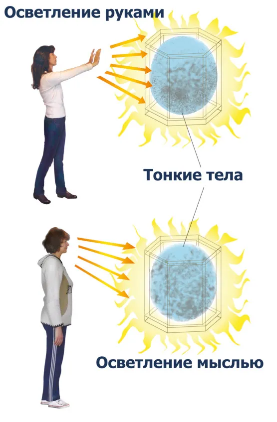 Расположив перед собой эллипсоид тонких тел удобного для работы размера, разводим свои руки-крылья и начинаем осветление пространства вокруг тонких тел, постепенно сжимая руки до полного соприкосновения ладоней. В этом состоянии желательно подержать руки около одной минуты. Как и в случае с чисткой чакр аналогичным способом, во время сведения рук мысленно осветляем не только содержимое пространства между ладонями, но и сами тонкие тела. Скорость сведения рук должна подчиняться для людей, чувствующих энергии, естественному движению с небольшой приложенной силой. Или со скоростью 0,5м. в три минуты. При этой скорости рук большинство энергий могут быть осветлены. На первых этапах работы, если ваши руки чувствуют энергии, торопиться не следует. Иногда полезно остановить сведение рук на несколько минут, и мысленно осветлять всё пространство между ладонями, направляя туда мыслью светлые яркие потоки энергий. Мысленная работа всегда дополняет работу рук. Тонкие тела в этом смысле очень похожи на чакры, и являются древнейшими накопителями энергий, связанных и с Родом, и с собственными воплощениями человека. Если учесть, что тонких тел у человека не менее тысячи, и для каждого существуют весьма объёмные пространства, то можно говорить и о больших объёмах тёмной энергетики, хранящейся в них с очень далёких времён. Человек периодически покидает своё тело, но это не меняет суть истории тонких тел, так как вся информация об энергетическом состоянии человека всегда после его ухода с Земли записывается Ангелом-Хранителем. Она служит основой новой жизни в виде начальных условий, частично отражающих и состояние прошлых накоплений тонких тел. Поэтому их очищению желательно уделять достаточно внимания. Что касается количества циклов работы в прямом пространстве, то данная ситуация мало чем отличается от матричной работы. Добросовестная чистка тонких тел имеет и ещё одно основание. Вы же помните, что для человека тонкие тела являются не только хранилищем резервных энергий, но и частью системы управления нашим физическим телом. Это значит, что для любого человека существует достаточно оснований, чтобы проводить их очищения, тем самым не только повышая свои вибрации, но и освобождая от возможных заболеваний, которые готовы появиться из-за загрязнённости тонких тел.
