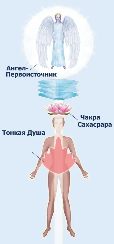Далее, протянув свои смоделированные вами, например, десятиметровые крылья к Ангелу, необходимо охватить его всего сверху, и обводя крыльями вниз, постепенно приблизить их к себе, представляя, как в той зоне, где прошли крылья, формируется цилиндр, наполненный энергиями Творца и устремлённый вниз. Можно представлять, как этот воссозданный канал проходит через космические чакры. Проводя вытянутые руки далее вниз мимо себя, вы должны наблюдать, как этот цилиндр удлиняется, проходя мимо вас. Когда вам будет не хватать рук для продолжения формирования канала вниз к самой нижней чакре, просто мысленно удлините разведённые на том же расстоянии крылья. Продолжайте это формирование до самой нижней чакры, место которой вы определите мысленно сами. Пространство подстроится под исполнение ваших намерений, и та чакра, о которой вы подумаете как о последней, реально будет последней вашей чакрой. Понимая, что из ваших рук течёт энергия Творца, создающего и наполняющего сформированный канал, вы можете мысленно, помогая себе крыльями, водить ими по поверхности этого канала сверху вниз и снизу вверх, продолжая наполнять его энергией. Эта процедура может занять у вас около нескольких минут, но это не догма, и все свои действия вы проводите на своё усмотрение. Так как изображенная на рисунке часть энергетической структуры реально превосходит размеры человека, то вы можете мысленно масштабировать её в несколько меньшие размеры и располагать перед собой на таком уровне, где вам было бы удобно работать. Принципиального значения по отношению к качеству работы это не имеет. Иногда для удобства можно располагать своего Ангела-Первоисточника на уровне, например, своей головы, потому, что в ряде случаев именно с ним необходима более длительная, чем указано ранее, работа по причине его загрязненности. Поймите правильно, энергетическая грязь на Ангеле – это реальность, и не только для Ангелов-Первоисточников. Так устроен мир. Энергетика Ангела – Первоисточника, как и ещё девяти Ангелов, расположенных над ним тесно связана с функционированием физического тела, и часто, его загрязнения несут человеку болезни и боль, но об этом – в другой методике.