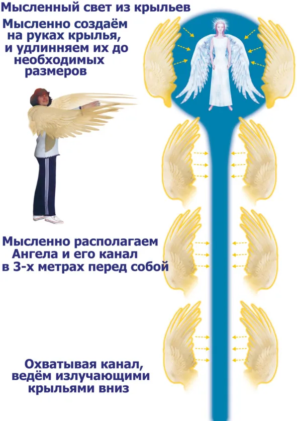 Мысленно проходя через себя, вы точно также убираете грязь из канала, который располагается в вашем теле. Далее, удлиняя сомкнутые крылья, вы доходите ими до конца канала и осветляете остатки тёмных энергий уже за самой нижней чакрой. Разумеется, для нижних чакр движение ваших рук может быть только мысленным. Для удобства можете просто перемещать картинку вверх, работая с ней на удобном для рук уровне. Все действует. Время, требуемое для очищения канала, более длительное и ориентировочно составляет 10—15 минут. Не торопитесь быстро пройти его руками, вы упустите много энергий в канале, требующих осветления. Там в основном собраны энергии Рода, Кармы, и космоса и они достаточно тяжелы. К слову сказать, что наиболее эффективное очищение канала можно проводить, призвав энергию Гелиоса. Она очень похожа на огонь костра, или в более ярком воплощении – цвета яркого