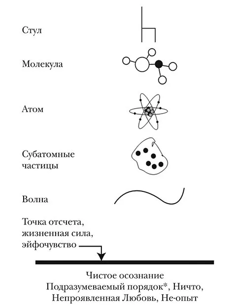 Вы на своем опыте почувствуете это чуть позднее, когда научитесь останавливать мышление, а затем наблюдать, как ваши мысли вновь материализуются из ничего. Сейчас же давайте вновь взглянем на воспринимаемую часть творения, изображенную над горизонтальной чертой.
