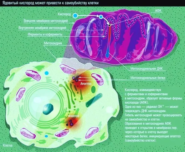 Накапливаясь в митохондриях, радикалы становятся очень опасны и могут вызвать тот самый окислительный стресс, который и провоцирует старение. При этом разрушается сначала митохондриальная ДНК, а затем и главная, ядерная. Это происходит во время сбоев в работе организма и при старении. Организм, конечно, борется с больными клетками, включает механизм их самоликвидации – апоптоз. Что, собственно, и происходит, допустим, при инфаркте – массовая гибель клеток в результате избытка свободных радикалов. Но есть клетки, в которых механизм апоптоза нарушен, и они продолжают существовать со множеством мутаций. Такие клетки могут переродиться в раковые, но, даже не переродившись, они значительно ухудшают работу органа.