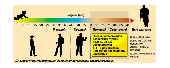 По возрастной классификации Всемирной организации здравоохранения, биологический возраст сейчас существенно изменился. От 25 до 44 лет – это молодой возраст. 44 – 60 лет – это средний возраст. 60 – 75 лет – пожилой возраст. 75 – 90 лет – это старческий возраст. И после 90 – это долгожители.
