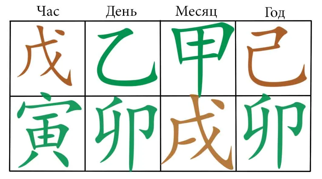 В этой карте иньское Дерево ДД использует янский Металл 庚 как мужа, в девятый месяц 庚 без Ци, и иньское Дерево 乙 использует янский Огонь 丙 как потомство, при чем в часе янский Огонь Бин 丙 получает фазу Рождения в ветви Тигра (Инь) 寅, приближается ветвь Собки (Сюй) 戌 объединяясь в структуру, они принадлежат к Огню.