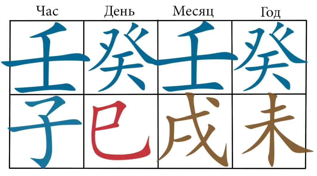 Дд иньского Металла 辛 использует янский огонь 丙 как ПЧ, сама ДД сидит на ветви Петуха (Ю) 酉, получает исключительное Служебное благополучие и сама процветает. В Часе вытягивается столп Иньского Металла на Кролике (Мао) 辛卯 как Металл. Другой (то есть дубликат ДД в Часе) отходит бессильный, поэтому сам ДД прямой, а тот другой – Косой. Здесь две женщины борются, соперничая за мужчину, Прямой и Косой ищут свое место.