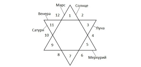 Юпитер не представлен в этой схеме, потому как это духовная планета, стоящая выше всего земного, и потому распределена (неравномерно, правда) по всем домам гороскопа.