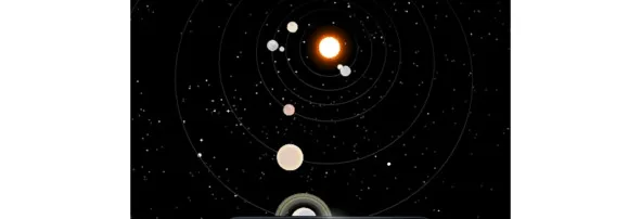 Вид Солнечной системы со стороны северного полюса Земли, которая слева от Солнца, Меркурий справа и ниже.