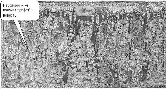 Роспись по ткани в стиле каламкари, изображающая состязание лучников за руку Драупади