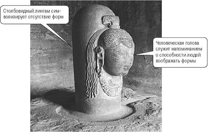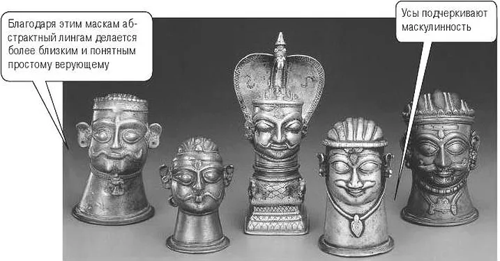 Во многих храмах на каменном лингаме вырезают лицо или множество лиц либо же надевают на лингам латунную маску с изображением лица. Это лицо отождествляют с Шивой. Кроме того, лицо служит напоминанием о том, что голова человека отличается от всех других голов, которые встречаются в животном царстве. В ней расположен высокоразвитый человеческий мозг, способный воображать, а следовательно, прокладывать себе путь в мир божественного. С похожей целью накладывают ритуальные маски на лбы верующих: чтобы напомнить им о том, какую важную роль играет мозг (а значит, и воображение), – ведь это он делает нас людьми.
