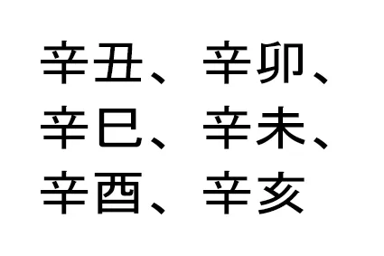 辛丑、辛卯、辛巳、辛未、辛酉、辛亥