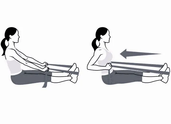 6) упражнение для спины, плеч и рук с фитнес-резинкой. Исходное положение: сидя на полу, спина прямая, ноги выпрямлены, стопы вместе. Помести резинку так, как показано на рисунке (закинуть “петлю” на стопы, взяться за концы руками). Упражнение: одновременно с выдохом сгибай руки, подводя их к корпусу так, чтобы твои кулаки коснулись таза. Локти согнуты, лопатки сведены, плечи развернуты назад. С вдохом выпрями руки обратно. Повторить 15-20 раз за 2-3 подхода.